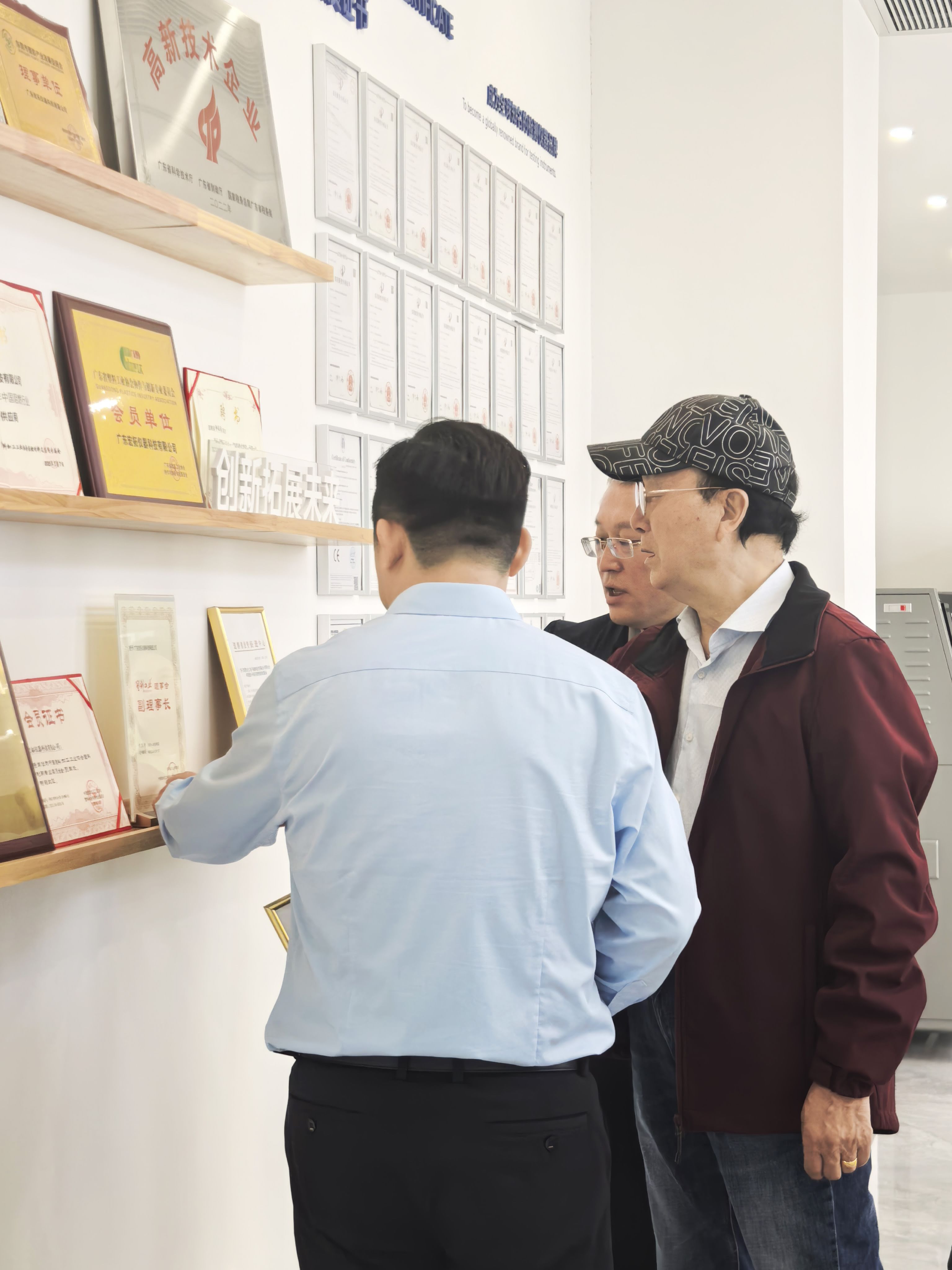 塑料协会领导们在钟董的陪同下,首先参观宏拓仪器数字化展厅。通过钟董的热情讲解,塑料协会领导们全面了解宏拓仪器从企业初创到技术突破和荣誉沉淀的成长历程,国家级高新技术企业、科技型中小企业、创新型中小企业、广东塑协塑料检测技术咨询服务中心等等,满满一面墙的荣誉资质是宏拓仪器多年来在技术研发、产品创新以及标准化建设等方面持续投入和取得卓越成果的集中体现。